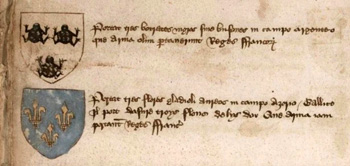 El escudo de Clovis, de El Libro de Horas de Bedford, c. 1423, abajo, un manuscrito medieval registra el cambio de ranas a lirios