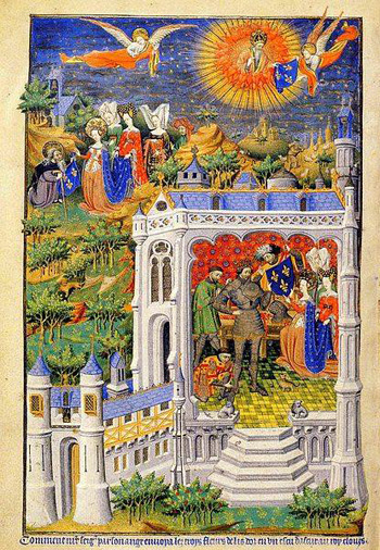 Había un piadoso ermitaño que vivía cerca del castillo, junto a un lugar donde más tarde se construiría el Monasterio de Joyenval. La reina Clotilde consultaba en ocasiones a este santo monje. Un día, mientras el ermitaño estaba orando, se le apareció un ángel con un escudo sobre el que estaban colocadas las tres flores de lis sobre un fondo del color de un sereno cielo azul.